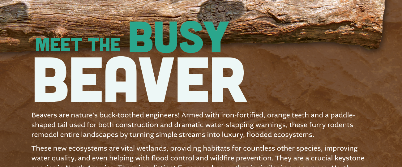 Meet the busy beaver! Armed with iron-fortified, orange teeth and a paddle-shaped tail used for both construction and dramatic water-slapping warnings, these furry rodents remodel entire landscapes by turning simple streams into luxury, flooded ecosystems.